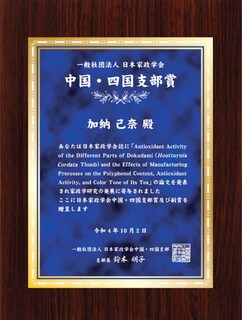 2022年10月2日に、人間社会科学研究科健康・行動科学コースの加納 己奈さん(指導教員:鶴永陽子教授)が、日本家政学会 中国・四国支部賞を受賞しました。若手研究者の奨励を目的とした賞で、2021年度に日本家政学会誌に掲載された「Antioxidant Activity of the Different Parts of Dokudami (Houttuynia Cordata Thunb) and the Effects of Manufacturing Processes on the Polyphenol Content, Antioxidant Activity, and Color Tone of Its Tea」が評価されての受賞となりました。この論文は、製茶工程がドクダミ茶の重要な機能性である総ポリフェノール含量、抗酸化性等に影響を及ぼすことを明らかにしたもので、人々の健康増進や家政学の今後の発展に寄与するとの評価をいただきました。